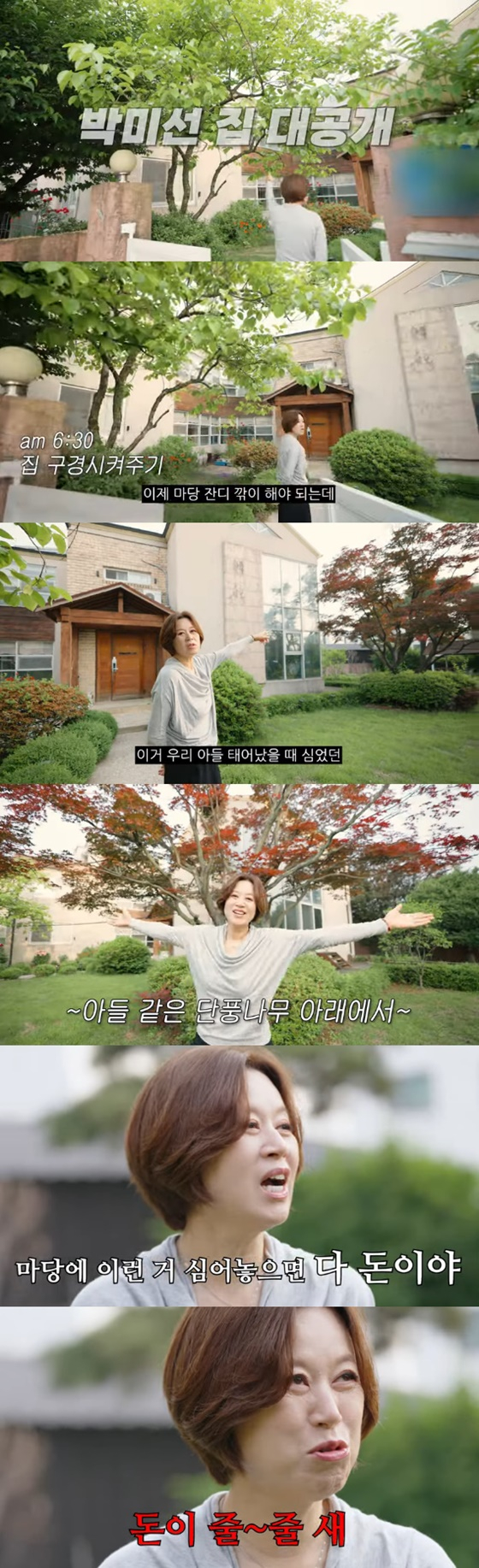박미선은 "이제 마당 잔디깎이를 해야 한다"고 말했다. 이어 마당에 심어진 단풍나무를 가리키며 "아들 태어났을 때 심었던 단풍나무가 이렇게 자랐다"고 밝혔다.