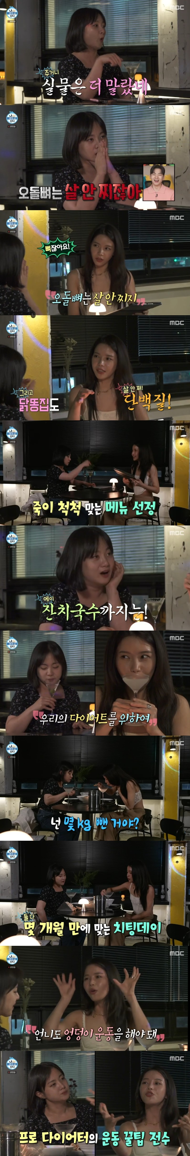 다이어트 중이라던 박나래와 솔라는 음식 메뉴로 파스타와 오돌뼈, 닭똥집, 잔치국수를 주문했다. 심지어 박나래는 솔라와 대화를 하면서 멈추지 않고 흡입하면서 완벽한 치팅데이를 즐겼다.