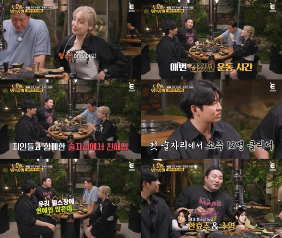 윤균상은 "그 첫 술자리에서 히밥이랑 나랑 둘이 소주를 열두 병 마셨다"라며 두 사람의 놀라운 주량을 깜짝 고백했다. 이때 박광재는 "우리 헬스장에도 연예인 진짜 많이 다니는데 안 친해지더라. 한효주 배우도 오고, 소녀시대 수영도 오고..."라며 부러움에 말끝을 흐렸다.