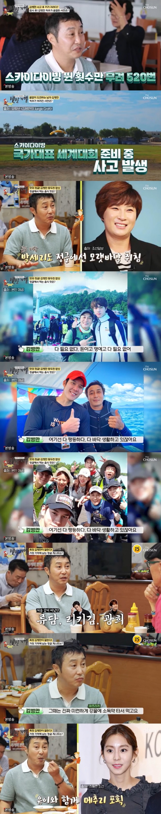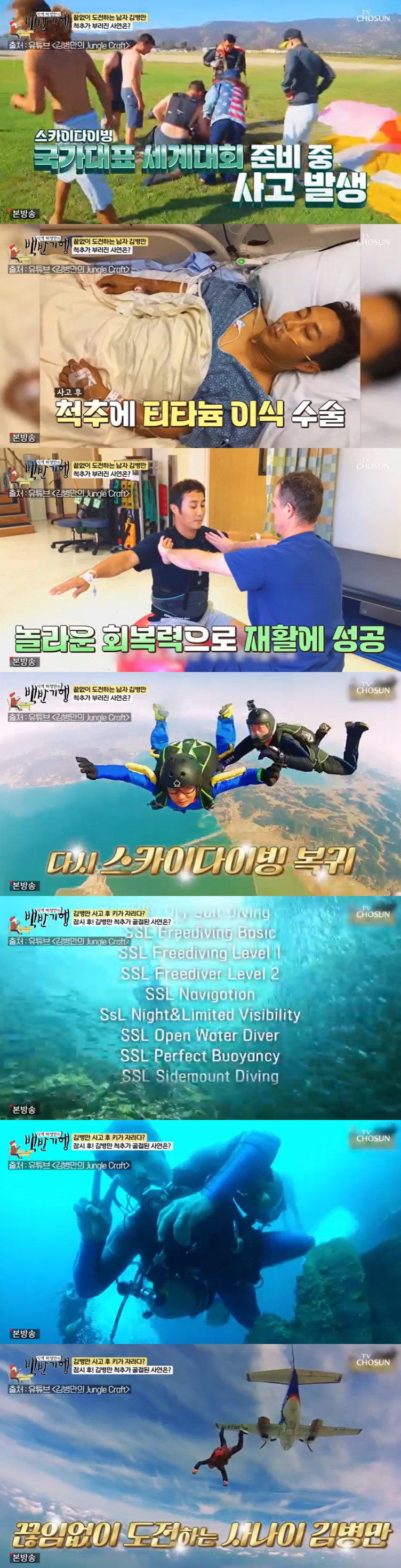 김병만은 "스카이다이빙 교관인 '탠덤 교관'까지 갔다"라며 "520번 점프했다"라고 밝혔다. 사고가 많이 나지 않냐는 질문에 그는 "2017년에 한번 요추가 부러졌다"라며 스카이다이빙 국가대표 세계대회 준비 중 심각한 부상을 당해 척추에 티타늄을 이식했던 일을 떠올렸다. 김병만은 놀라운 회복력으로 재활에 성공, 다시 스카이다이빙에 복귀했다고 밝혔다.