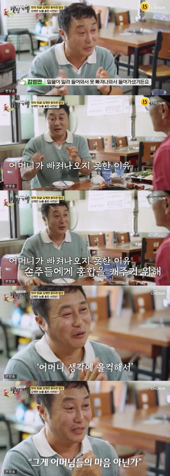 가게 사장님을 만난 후 어머니가 생각난 김병만은 눈물을 참지 못하며 "(어머니가 돌아가신 지) 이제 3년째 됐다"라며 재작년 대서특필된 갯벌에서 밀물 고립 사망 사고의 사망자가 자신의 어머니였다고 밝혔다. 김병만은 "썰물 때 바다에 들어가셨다가 밀물이 밀려 들어와서 못 빠져나와서 돌아가셨다. 어머니가 빠져나오지 못한 이유가 손주들에게 홍합을 캐주기 위해서라고 하더라. 나오면서도 그걸 안 놨다고 하더라. 그게 어머님들의 마음 아닌가 싶다"라고 털어놨다.