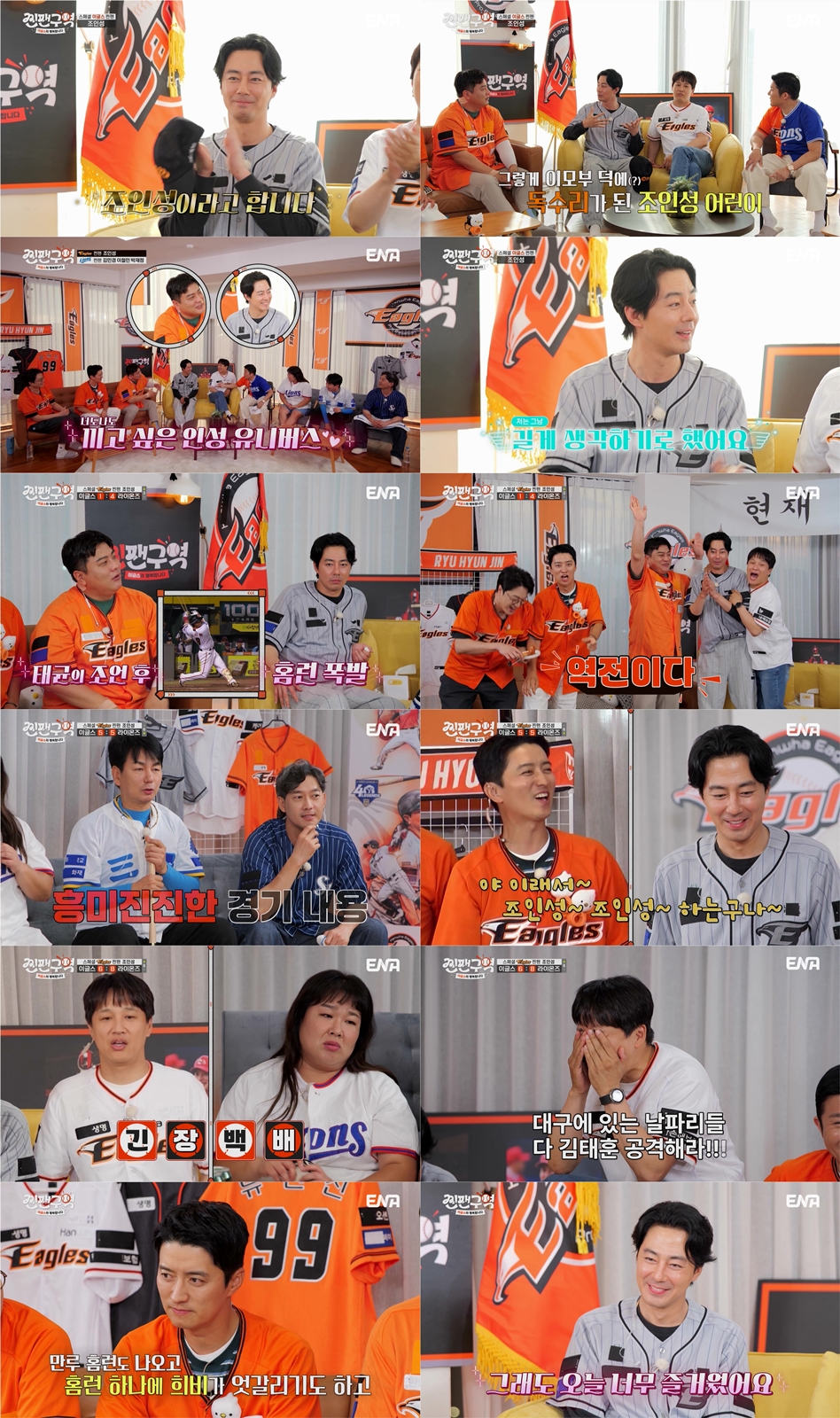 지난 10일 방송된 ENA&채널십오야 예능 '찐팬구역' (연출 박인석/작가 강윤정/제작 스튜디오 수파두파, 에그이즈커밍)은 '그깟 공놀이'에 인생을 걸고 사는 찐팬들의 처절한 응원기로 팬이 주인공이 되는 최초의 스포츠 예능. 첫 시즌은 한화이글스 팬들의 이야기가 담긴다. 10회는 낀팬 MC 조세호와 김환 특파원과 함께 한화이글스의 찐팬 고정멤버 차태현, 김태균, 인교진, 이장원, 그리고 배우 조인성이 함께 하며 삼성 라이온즈 찐팬 배우 이철민, 박재정, 희극인 김민경이 투입되어 불꽃 튀는 응원 맞대결을 펼쳤다.