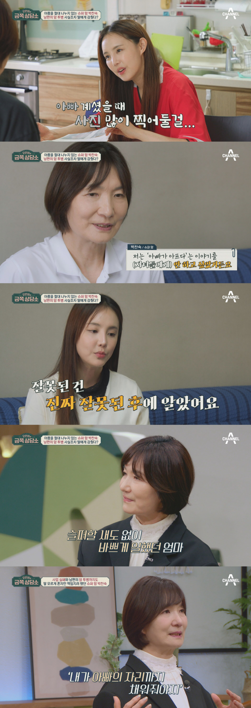 이에 박찬숙은 남편의 암 발견 후 수술과 치료를 병행했지만 이내 암이 전이되어 3년의 투병 끝에 세상을 떠났다고 밝힌다. 박찬숙은 암 투병 중인 남편을 대신해 가족들의 생계와 남편의 병원비를 책임져야 했고 자녀들에게는 아빠의 자리까지 채워줘야 했다며 가장으로서의 무거운 책임을 짊어졌음을 고백한다.