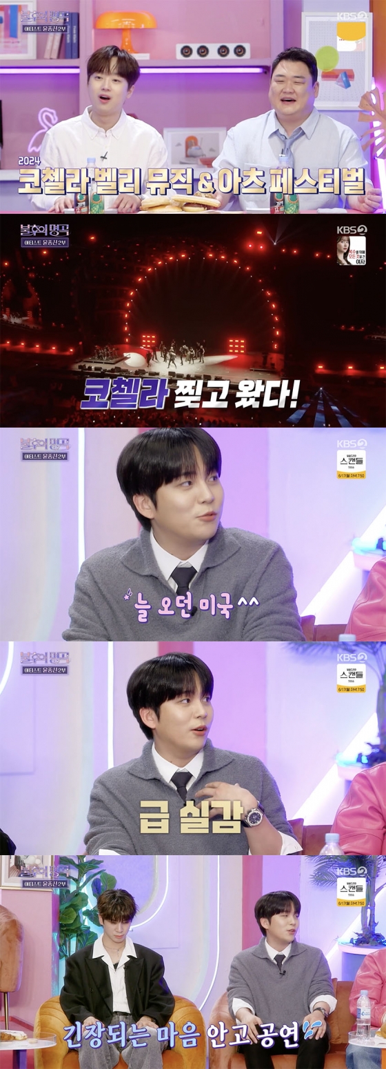 이날 대기실에서 MC 이찬원은 에이티즈 종호가 보이그룹 최초로 미국 코첼라 뮤직 페스티벌에 오른 것을 언급하며 무대 후기를 물었다.