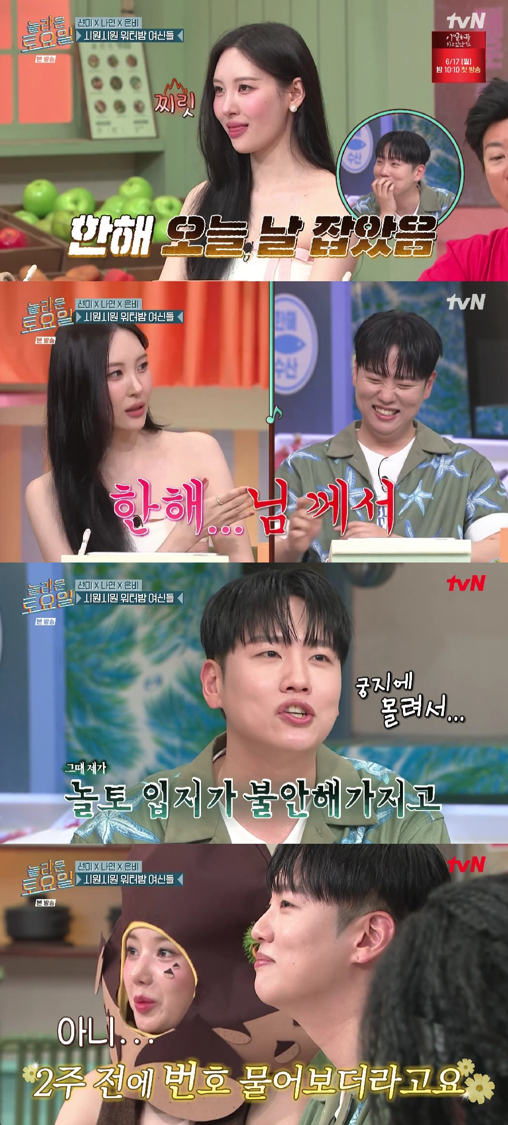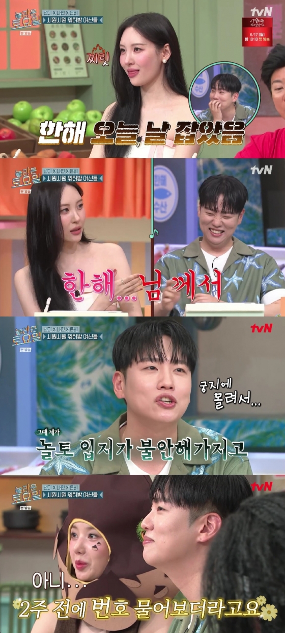 MC 붐은 "나연 씨 연락처는 아직 모르냐"라고 했고, 한해는 "실례가 안 된다면 다른 촬영 가서 '찐친'이라고 해도 되냐"라고 뻔뻔하게 물어 웃음을 안겼다.