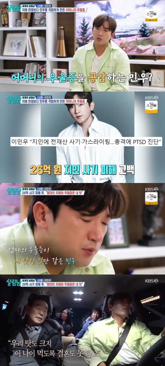 이에 이민우는 "우울증을 앓지 못한 사람은 모른다. 심해지면 극단적 선택을 고민할 정도가 된다. 저도 공감이 되니까 엄마가 얼마나 힘들었을까 싶다"면서 26억 원 지인 사기 피해를 언급했다. 앞서 이민우는 "제가 한 사람에게 가스라이팅을 당해 힘들게 지냈을 때 잠이 안 왔다. 진짜 힘들었다"며 "가장 믿었던 사람에게 배신당했다. 죽음까지 생각했다"고 말한 바 있다.