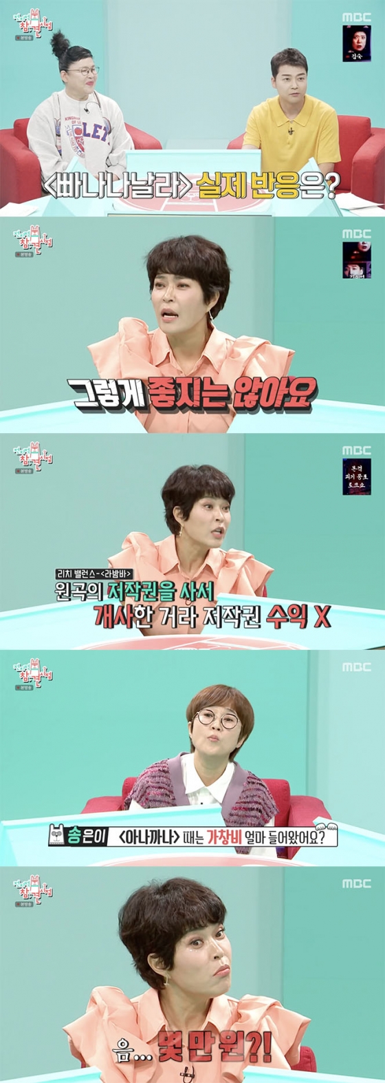 한편, 송은이가 "'아나까나'의 저작권료가 꽤 될 것 같다"라고 하자 조혜련은 "이 곡은 외국곡이다. 원곡의 저작권을 사서 개사한 거라 저작권을 터치할 수 없기 때문에 수익이 없다. 대신 가창비 수익은 발생한다"라고 답했다. '아나까나'의 가창비 수익을 묻는 질문에는 "몇만 원 들어왔다"라고 답했다.