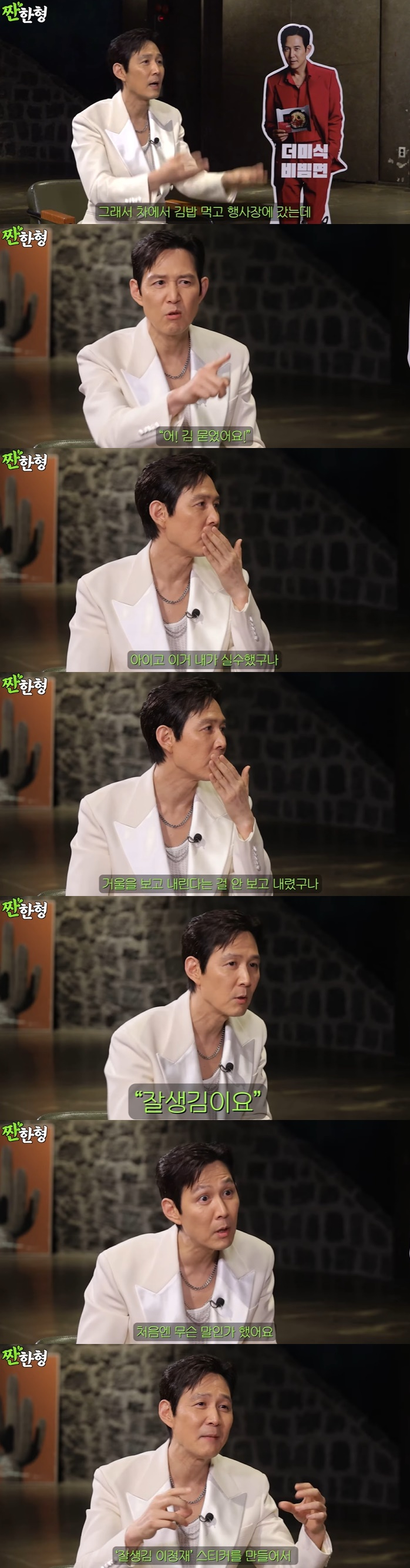 이어 그는 "하도 그게 화제가 돼서 내가 어떤 프로그램에 나가서 '잘생김 묻었다고 한 분 저희 회사로 전화 주세요'라고 했고 그분을 만나 점심을 같이 먹었다. 그런데 그분이 김을 포장해서 '잘생김 이정재' 스티커를 만들어서 붙여서 주더라. 저도 선물을 줬다. 아무튼 이 자리를 빌어서 감사하다"라고 전했다.