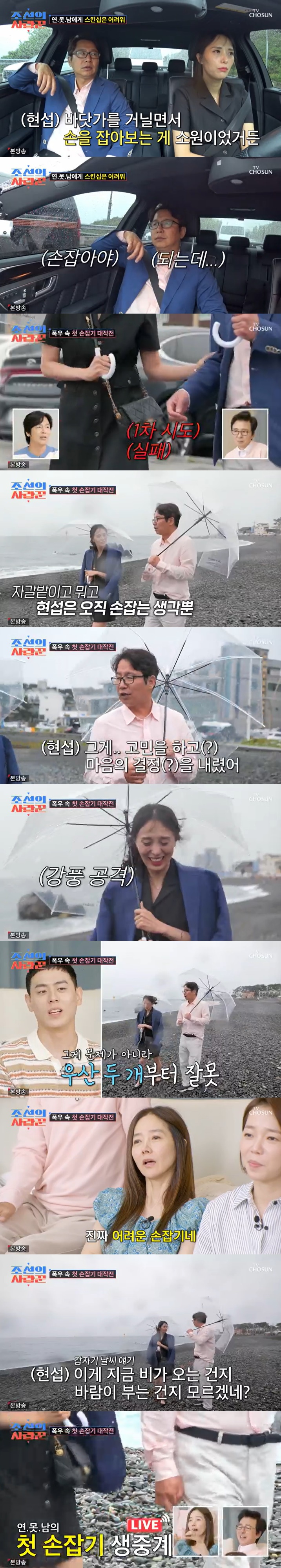 이날 심현섭의 머릿속엔 여친과 손잡는 생각밖에 없었다. 심현섭이 우물쭈물하자 모니터링하던 강수지는 "너무 보기 불편하다 진짜"라고 한숨을 쉬었고, 이관희는 "차에서 내릴 때 우산 두 개인 것부터 잘못이다"라고 지적했다.