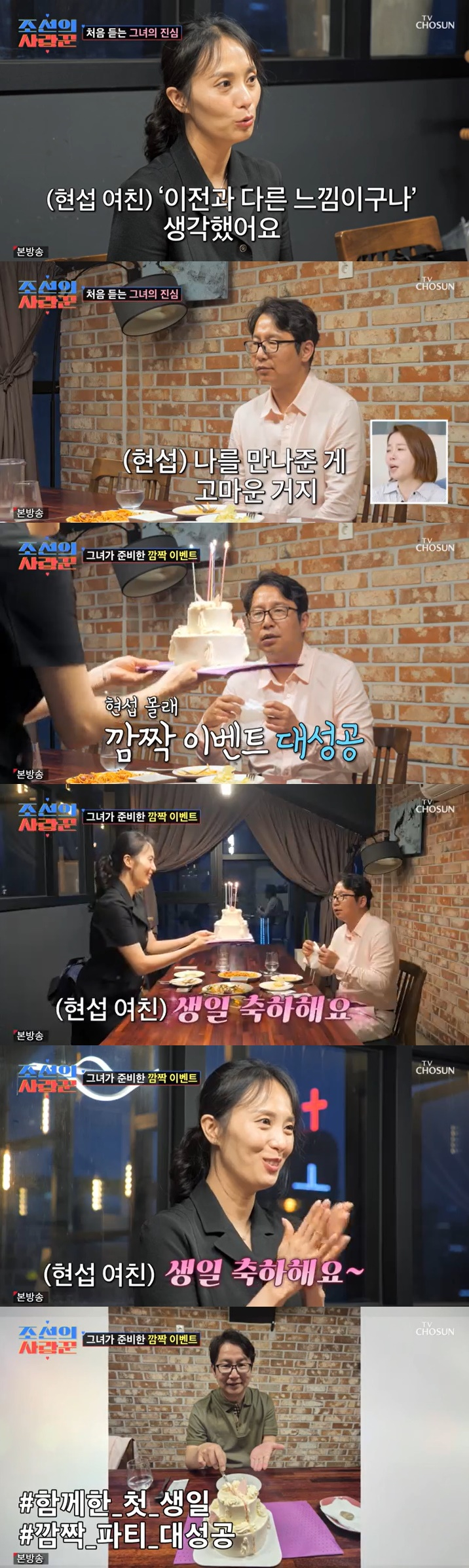 영림은 "오빠는 첫 느낌이 좀 애잔했다"라며 "소개팅하고 연락하던 분이 있었다. 오빠 만나고 그날 (그만 만나자고) 얘기했다. 오빠 만나고는 이전과 다른 느낌이구나 싶었다"라고 털어놨다. 이에 심현섭은 "나를 만나준 게 고맙다"라며 서로의 마음을 확인했다. 영림은 심현섭에게 깜짝 생일 축하 케이크와 커플티를 선물하며 감동을 선사했다.