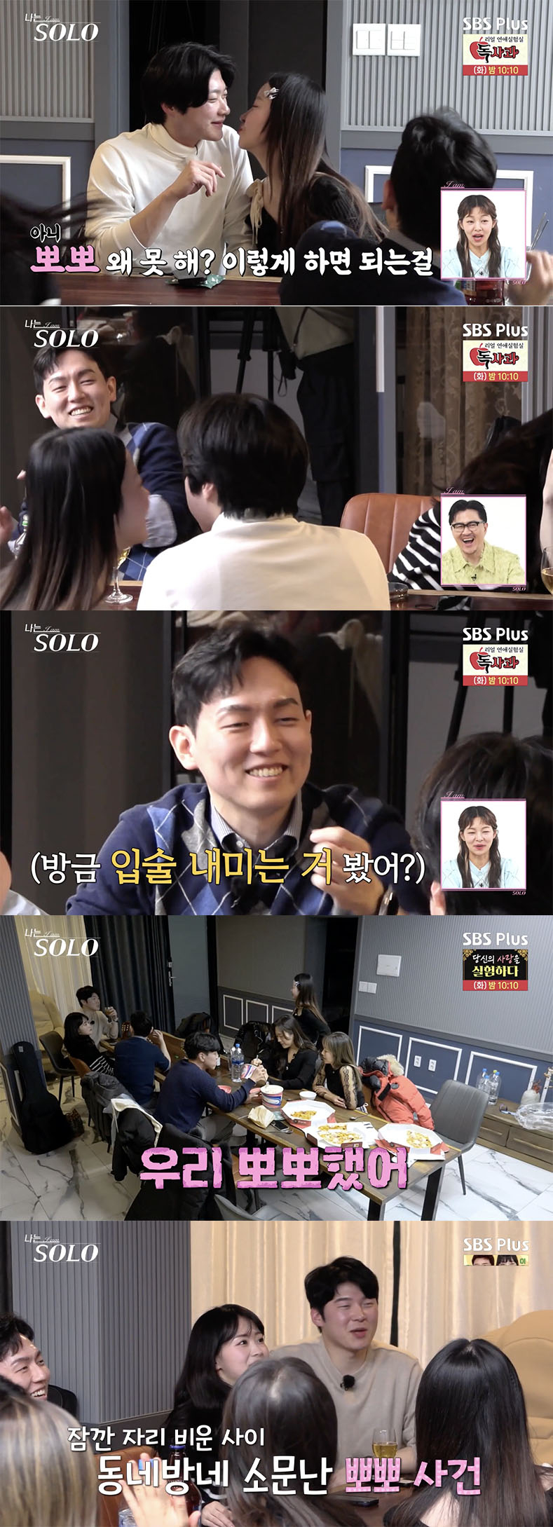 이후 영호가 술 자리에 합류했고, 영호는 전 출연진들이 두 사람의 '뽀뽀 사건'을 알고 있자 "누가 얘기했냐"라며 당황했다. 이어 영식이 "전부 30대 이상이지만 여기서는 뽀뽀가 되게 수줍다"라고 하자 정숙은 보란 듯이 "왜 못 해?"라며 다시 영호에게 가까이 자신의 입술을 가져가 뽀뽀를 시도했다.
