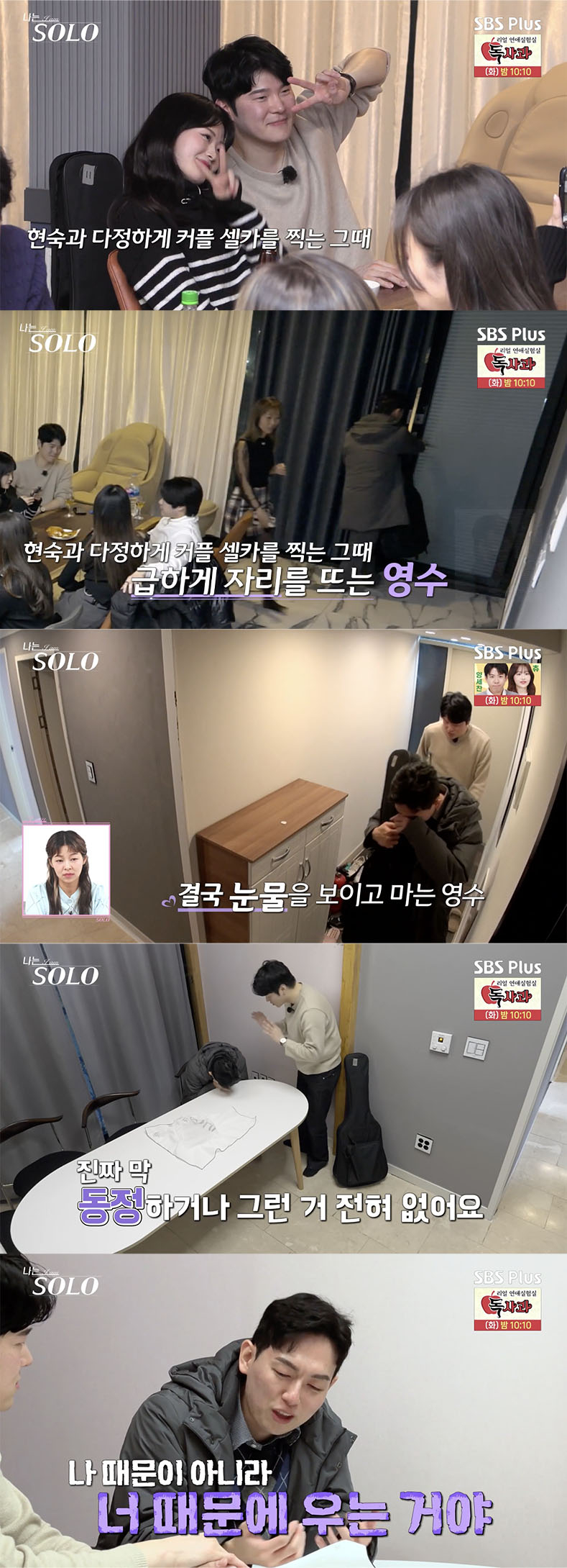 이날 영수는 자신이 선택했던 현숙이 영식과 다정한 모습을 보이며 셀카를 찍자 급하게 자리를 떴다. 영식은 그런 영수가 신경 쓰였는지 따라나섰고, 홀로 눈물을 보이는 영수를 목격했다.