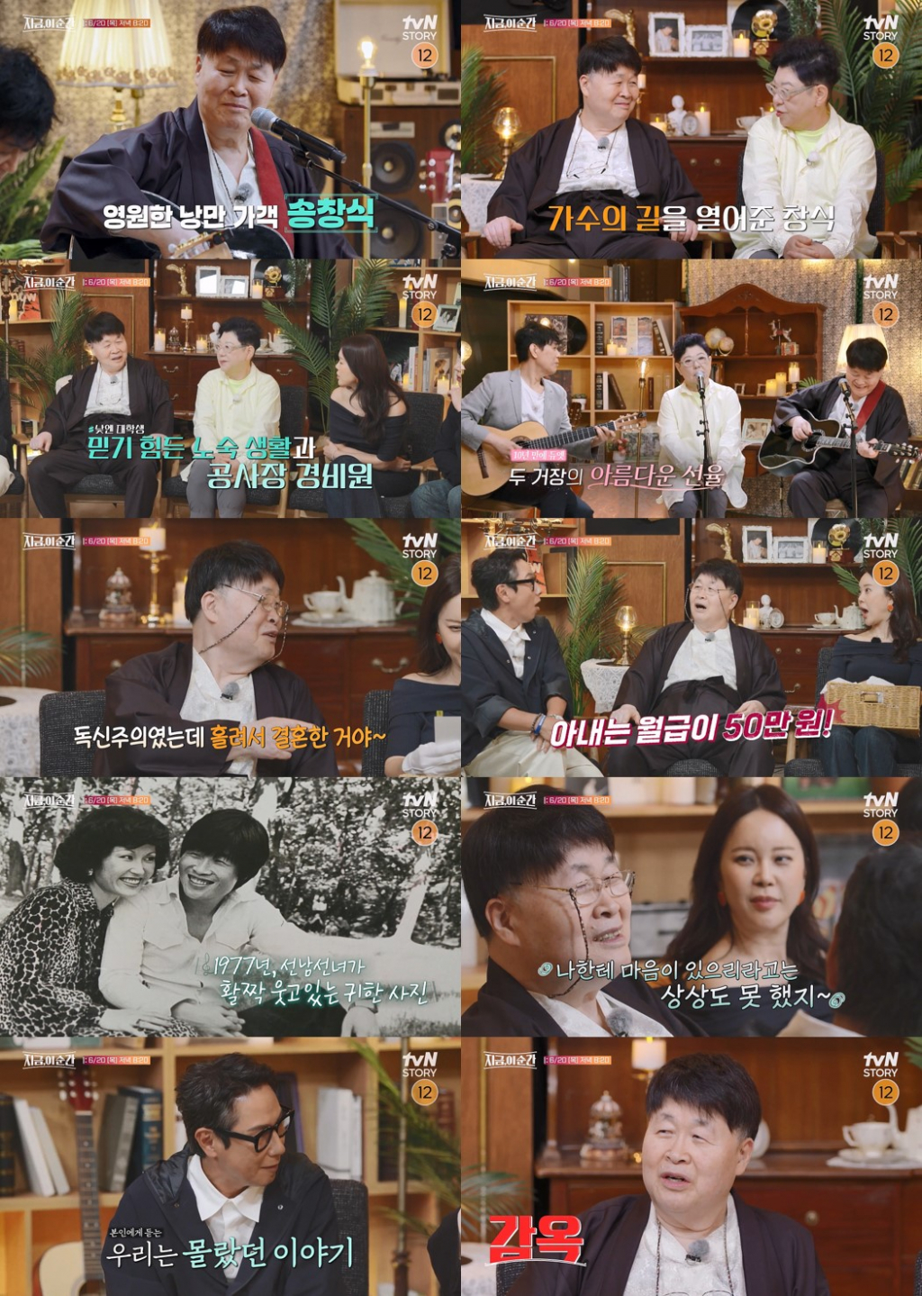 20일 tvN STORY '지금, 이 순간'의 3화에는 감성적이고 서정적인 포크 음악의 대표주자 송창식이 출연해 방송 최초 저택에서의 남다른 일상 공개와 함께 명곡 속 아무도 몰랐던 비하인드 스토리를 나눈다. 세 번째 '리빙 레전드' 송창식과 오랜 시간을 함께한 가수 양희은, 대한민국 최고의 기타리스트 함춘호와 스페셜 게스트 가수 안예은 그리고 몰래 온 특별 게스트까지 등장해 감동적인 공연과 다채로운 이야기들을 전한다.