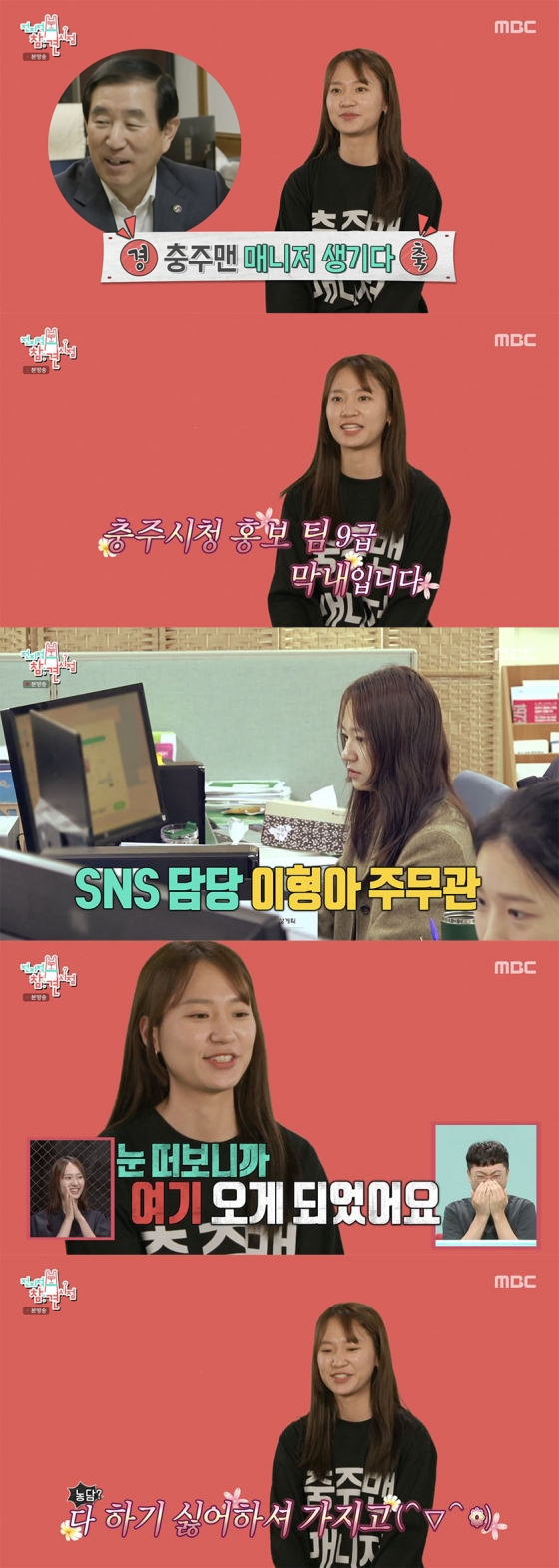 '충주맨 매니저'로 소개된 이형아 주무관은 "원래도 매니저 일을 했냐"라는 질문에 "따로 매니저를 구한 건 아니고 전 충주 시청 홍보팀 9급 막내다. 눈 떠보니까 여기 오게 됐다. (다른 분들이) 다 하기 싫어해서 저 말고 할 사람이 없었다"라며 용감하게 총대를 메게 됐다고 답했다.