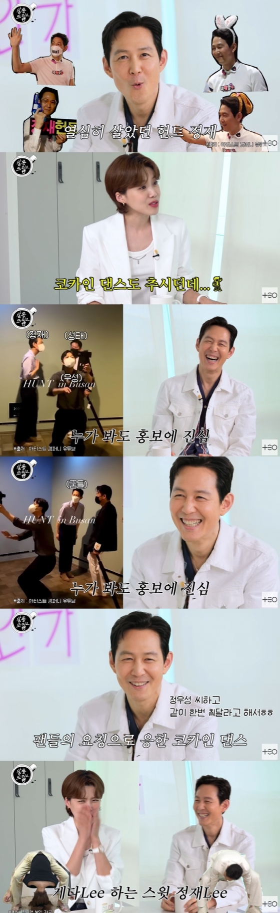 이에 이정재는 웃음을 터뜨리며 "마침 허성태 씨가 코카인 댄스로 엄청 이슈였다. 팬분들이 정우성 씨하고 한번 춰 달라고 해서. 팬 분들을 위해서라면"이라고 말했다.