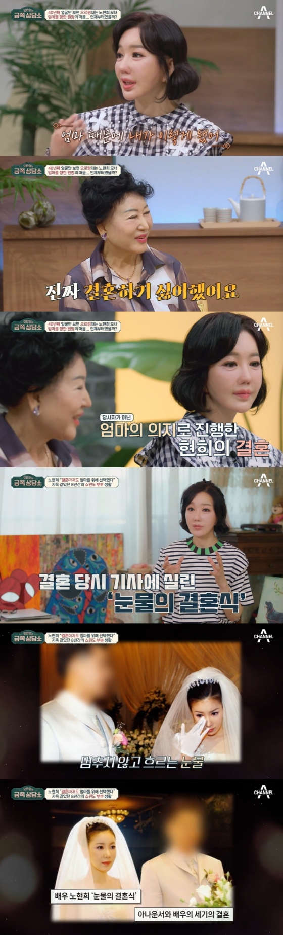 이날 노현희가 엄마한테 '원망'의 감정이 있다고 하자 노현의 엄마는 "내가 한 가지 후회하는 게 있다. 얘가 진짜 결혼하기 싫어했는데 억지로 결혼시킨 거다"라고 털어놨다.