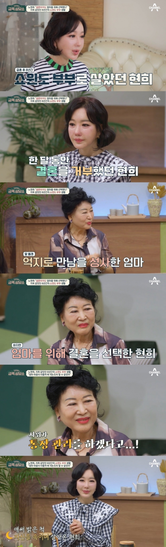 노현희 엄마는 "결혼하기 전부터 (사위가) 통장 관리를 하겠다고 하더라"고 했고 노현희는 "결혼생활 때 엄마가 우렁각시처럼 와서 도와줬다. 사위에게도 비난받기 싫었던 것 같다. 저는 상대 이미지 때문에 밤무대도 못 했다. 그때부터 위축된 생활의 시작이었다"고 말했다.