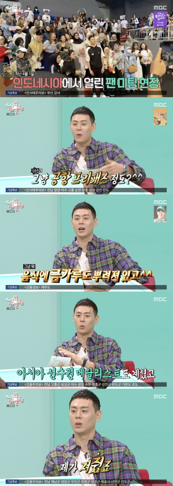이어 인도네시아 방문 중 본국 농구선수분들과 경기를 했다고도 밝혔다. "한국의 매운맛을 보여줬냐"라는 양세형의 질문에는 "아시아 선수권 메달리스트도 오고 유명한 프로 선수도 와서 져줬다. 다른 종목을 했으면 내가 이겼을 텐데. 이길까 말까 하다가 져줬다"라고 졌다는 얘기를 길게 늘어놓으며 허풍을 떨어 보는 이들의 웃음을 자아냈다.