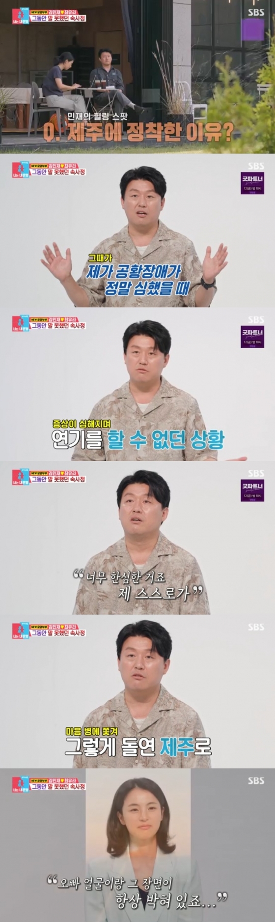 이날 방송에서는 김민재는 과거 힘들었던 시기를 고백했다. 제주도에 새 터전을 잡게 된 계기가 있었다고. 그는 "복합적인 게 있었다. 일단 연기를 그만두려고 했었다. 공황장애가 정말 심했을 때다. 어떤 날은 촬영을 접었었다. 숨이 안 쉬어지고 구토도 했다. 과호흡이 왔다. 탈진 증세가 와서 더 이상 연기를 할 수가 없었다"라고 털어놨다.