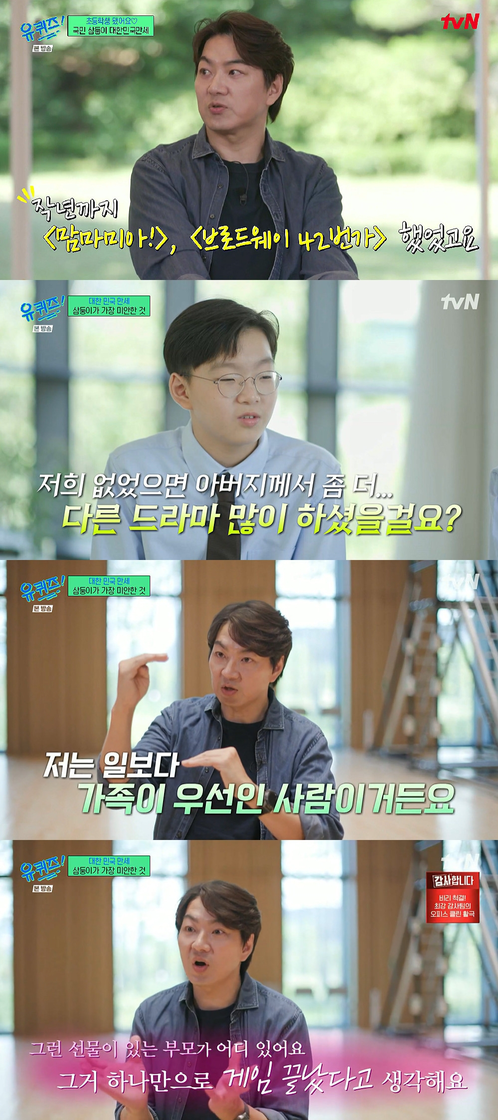 배우 송일국이 삼둥이 대한, 민국, 만세와 '유 퀴즈 온 더 블럭'에 함께 출연해 작품 공백기에 대한 생각을 밝혔다.
