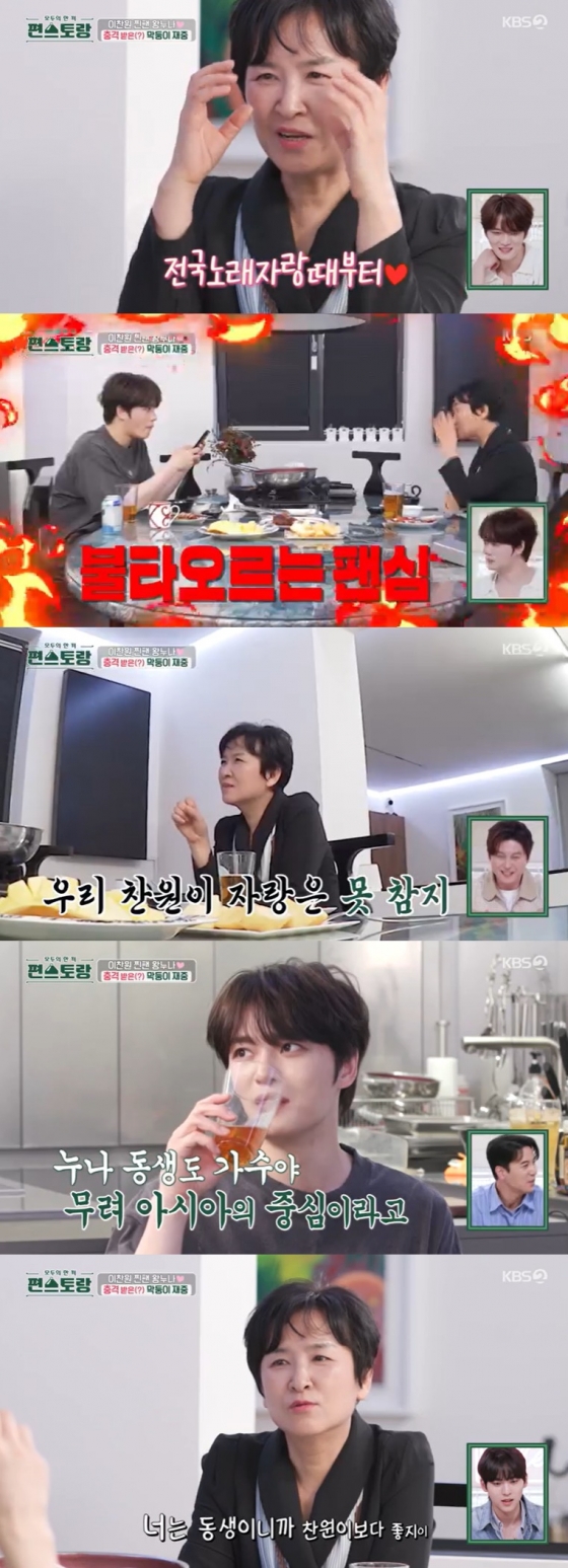 이어 김재중이 "누나 가수 누구 좋아해?"라고 묻자 김재중 누나는 "이찬원"이라고 밝혔다. 김재중 누나는 "사람도 좋고 음악도 좋고 밝지 않냐"라면서 자신의 아들과 비슷한 느낌을 받아서 좋아하게 됐다고 말했다.