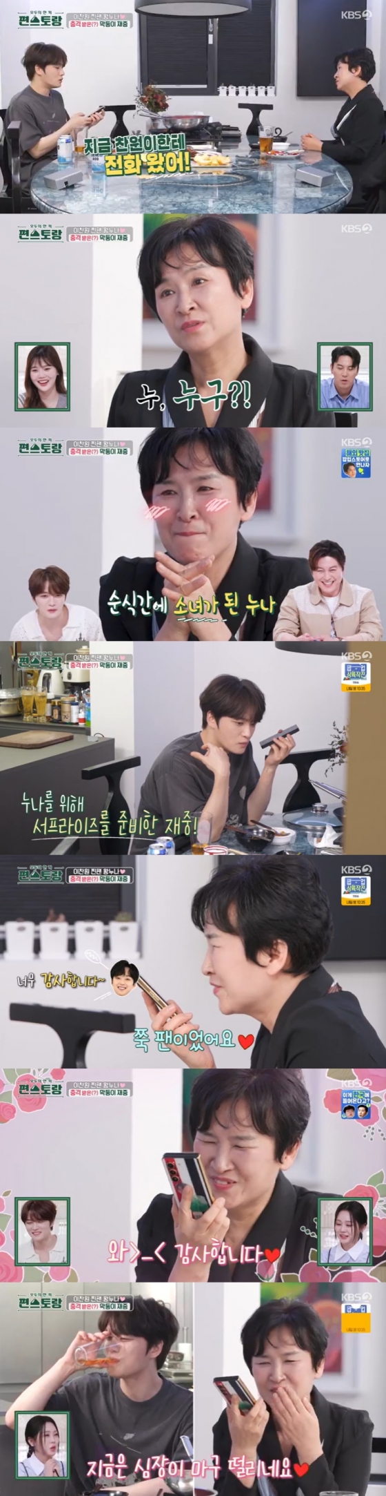 김재중은 누나를 위해 이찬원과 깜짝 전화연결을 했고, 김재중 누나는 떨리는 목소리로 전화를 받아 웃음을 자아냈다. 김재중 누나는 "'전국노래자랑' 때부터 쭉 팬이었다"라고 했고, 이찬원이 "다음번에 콘서트 할 때 꼭 모시겠다"라고 하자 김재중 누나는 "정말요? 와 감사합니다"라며 "제가 재중이하고 얘기하면서는 한번도 안 떨렸는데 지금은 너무 떨린다"라고 말했다.