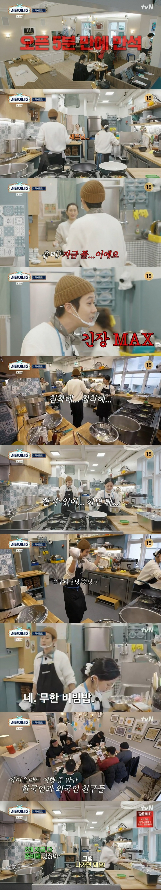 저녁 시간도 마찬가지였다. 오픈 5분 만에 전석 매진되는 이례적 기록을 장식한 것. 정유미는 주방팀인 최우식과 고민시에게 "셰프님.. 만석이에요"라고 조심스럽게 알렸고, 당황한 최우식과 고민시는 "할 수 있다"는 말을 반복하며 긴장감에서 벗어나려고 애썼다.