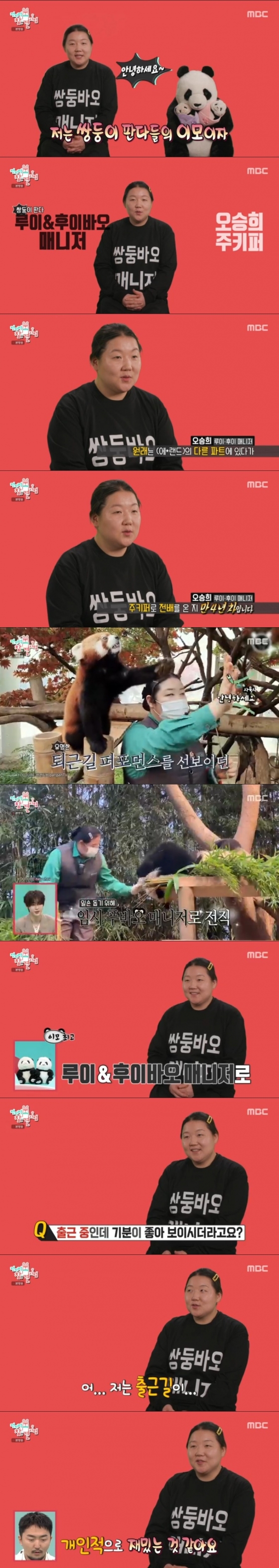 6일 오후 방송된 MBC 예능프로그램 '전지적 참견 시점'에는 에버랜드 판다 월드에서 일하고 있는 쌍둥바오의 매니저 오승희 주키퍼가 출연했다.