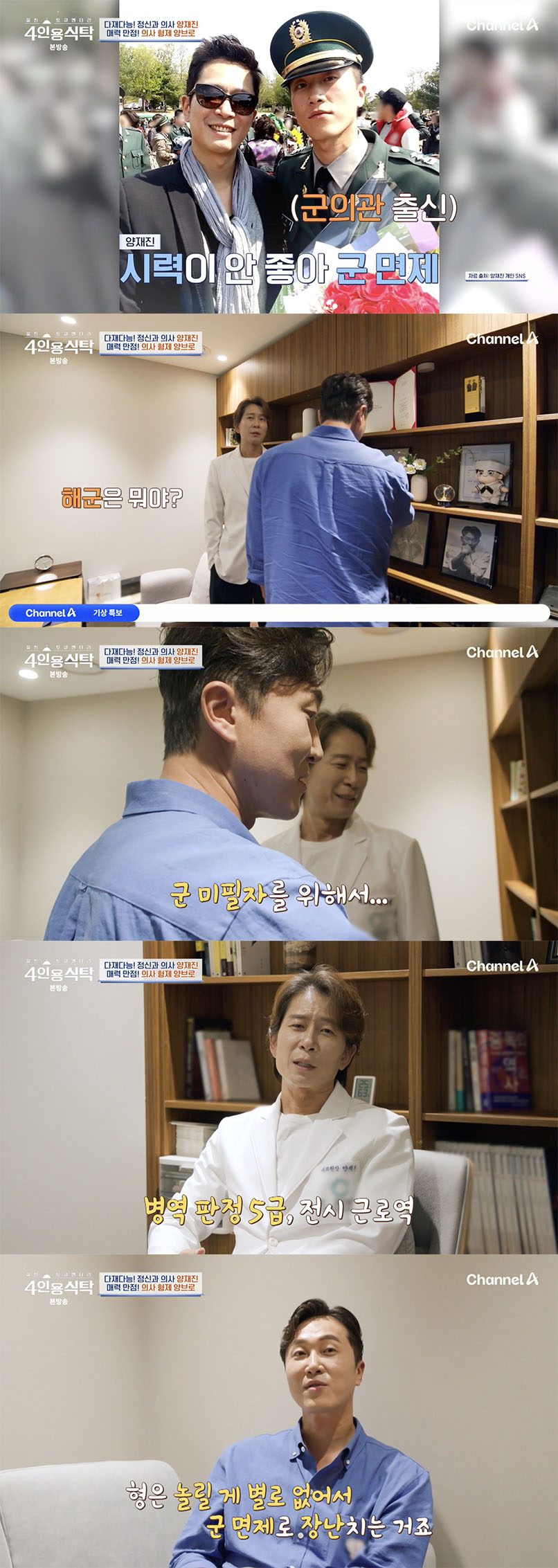 이어진 장면에서 양재웅은 "저는 군의관으로 다녀왔다. 형은 눈이 안 좋아서 (면제를 받았다). 형은 놀릴 게 별로 없어서 군 면제로 장난친다"라고 털어놨다. 양재진은 "병역 판정 5급, 전시 근로역이다. 면제지만 전쟁 나면 끌려간다"라고 너털 웃음을 지으며 덧붙였다.