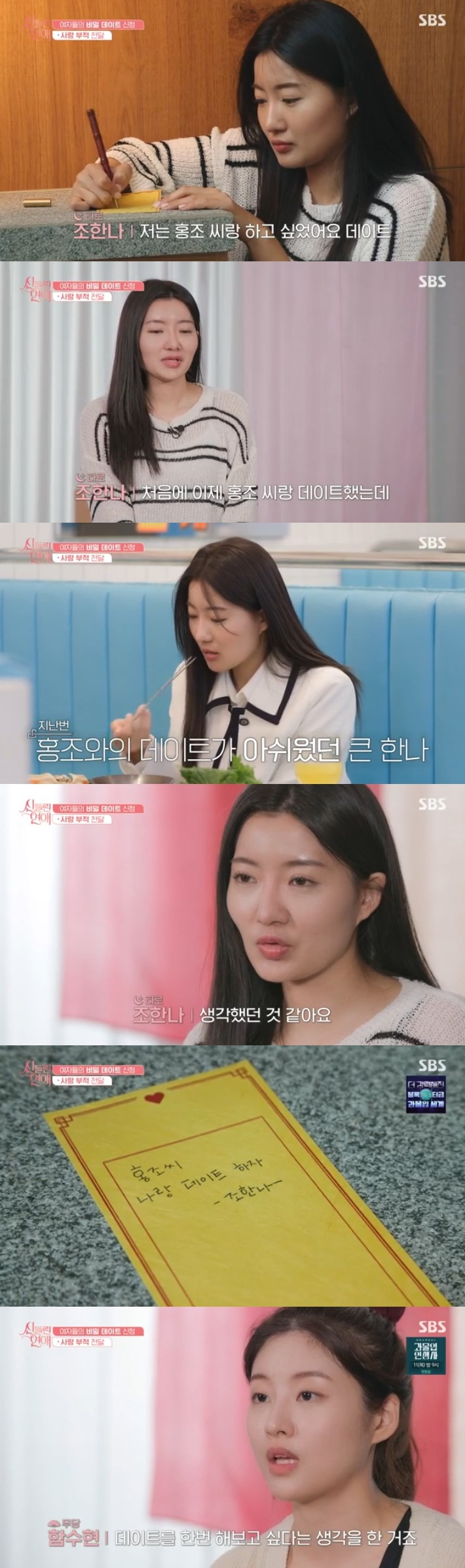 함수현 역시 이홍조와의 데이트를 원했다. 그녀는 "첫인상과는 다르게 대화가 잘 되더라. 숙소에서 사담 나누는 거 말고 데이트를 해보고 싶다고 생각했다. 궁금하기도 했다. 타로에서도 '진짜 데이트를 해봐야 안다'고 하더라'라고 밝혔다.