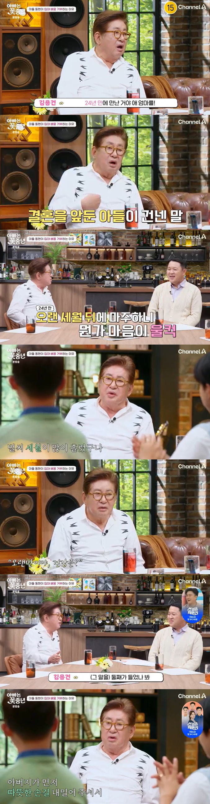 이를 모니터링하던 김용건은 "그래도 가. 그래도 가야지. 나도 둘째 결혼식 때 애 엄마를 24년 만에 만난 거다. 둘째가 나보고 '아버지, 엄마는 어떻게 하죠?"라고 물어보더라고. 내가 '야 오시라고 해'라고 했다"라고 둘째 아들인 워크하우스 컴퍼니 대표 김영훈(예명 차현우)과 배우 황보라가 2022년 결혼식을 올렸을 당시 겪었던 자신의 이야기를 공개했다.