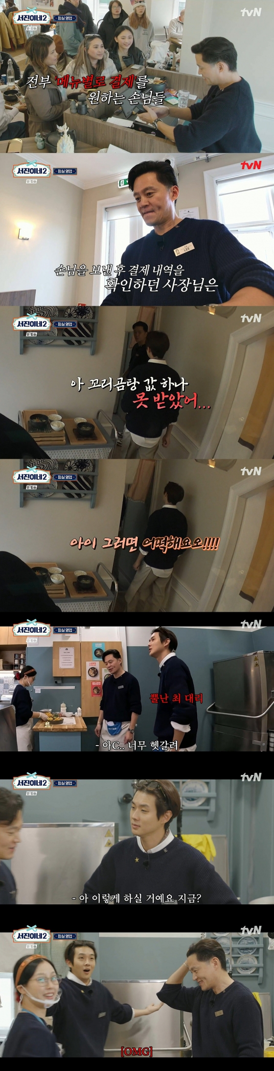 이날 이서진은 단체 룸 손님 7명이 메뉴별 분할 결제을 요구하자 당황했다. '서진이네2'를 운영하면서 분할 계산은 처음이었기 때문. 그는 당황한 듯 "너무 헷갈리네요. 죄송해요"라며 손님들에게 양해를 구했다.