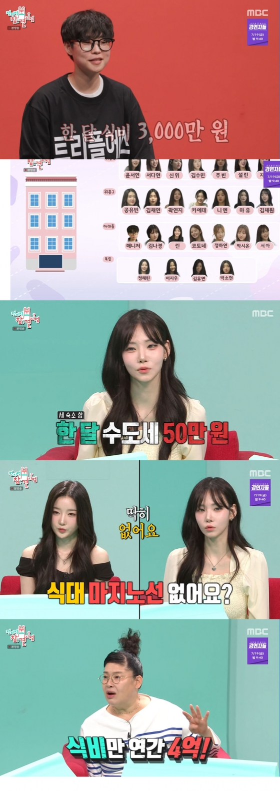 이를 스튜디오에서 지켜보던 김나경은 "스케줄 끝나고 와서 눈치 게임에서 지면 (빨래하기 위해) 뜬눈으로 지새운다. 수도세가 많이 나와서 연락해 온 적도 있다. 한 달 수도세만 50만원정도 나온다"라고 밝혀 모두를 놀라게 했다.