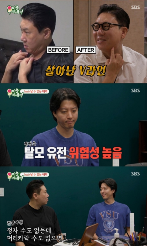 이날 방송에선 턱 밑 지방 흡입 수술을 받은 가수 이상민의 모습이 공개됐다. 확연히 달라진 V 라인을 자랑하는 이상민에게 배우 이동건은 "형의 태도 자체가 자신감 있어졌다"며 "사실 정수리가 비어 고민이다. 흑채를 뿌리고 촬영한지 10년도 넘었다. 어머니가 '미우새'(미운 우리 새끼)를 모니터 하시는데 속상해하신다"며 오래된 고민을 털어놓았다.