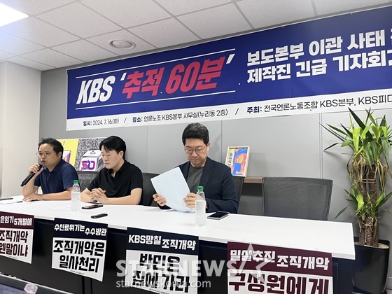 16일 서울 영등포구 KBS 본관에서 KBS 1TV 시사 교양 프로그램 '추적 60분' 보도본부 이관 사태와 관련한 제작진 긴급 기자회견이 진행됐다. 이 자리에는 '추적 60분' 현 제작진이자 시사교양 1구역 중앙위원인 김민회 PD를 비롯해 14년 전 보도본부 이관 시 '추적 60분'을 담당한 강윤기 PD, 김은곤 KBS PD협회 부회장이 참석했다.