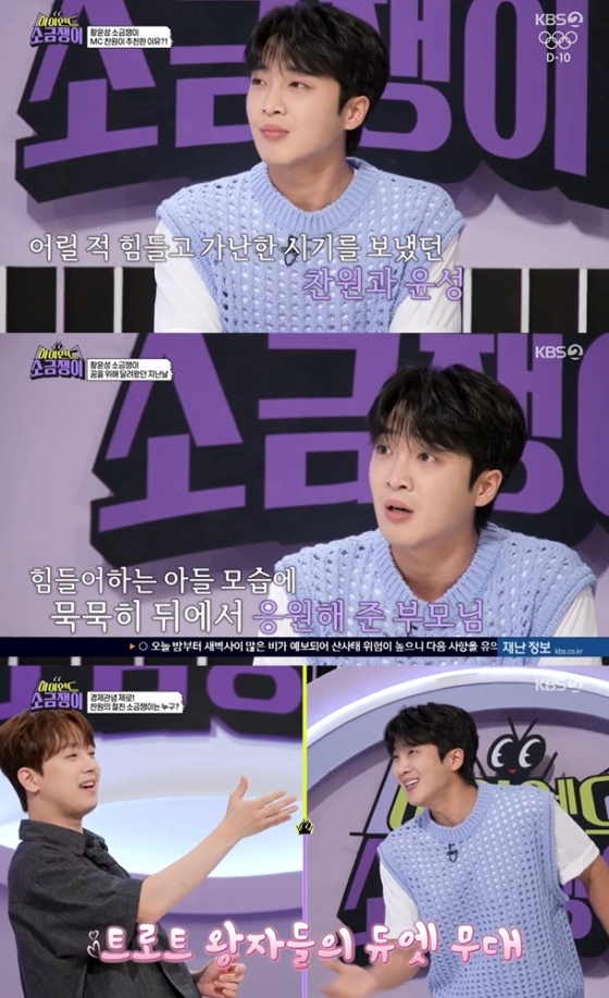 황윤성은 "꿈을 좇는다고 하지만, 부모님께 용돈을 드려야 하는데, 부모님이 묵묵하게 뒤에서 뒷바라지를 해주셨다. 그게 너무 감사하고 죄송하다"라며 울컥했다.