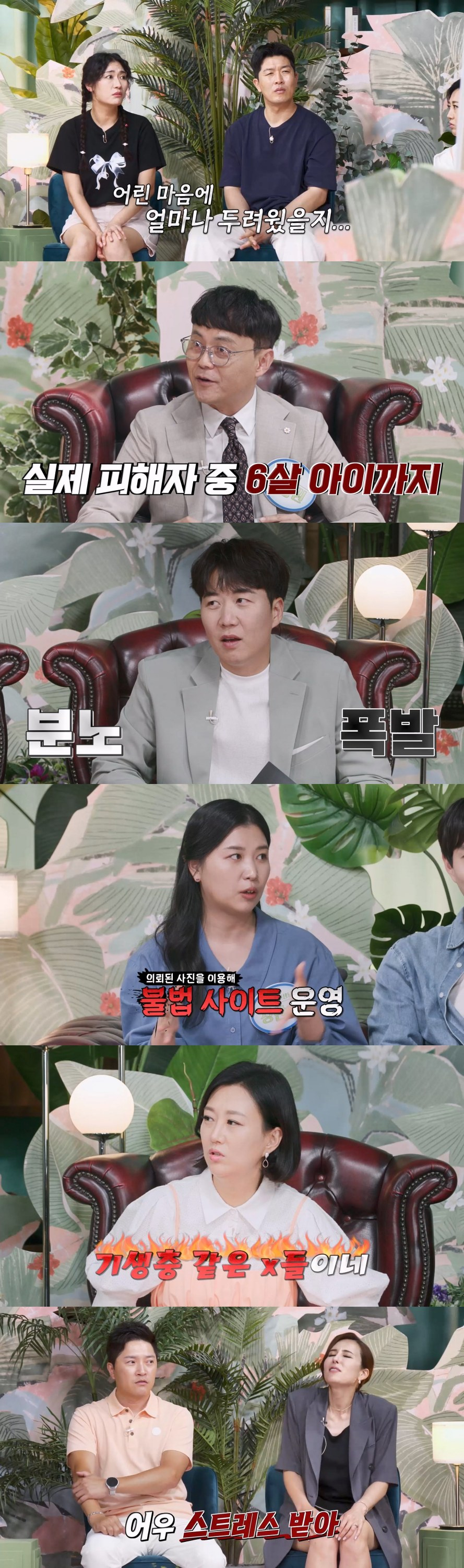 안타깝고 분통터지는 사건에 장윤정X도경완X안재모X김미려X김병현X에바는 말을 잇지 못하고 혀를 끌끌 찼다. 도경완은 "이게 현실에서 벌어지는 사건이냐"라며 믿기 어려워했다. 신중권 변호사는 "실제 피해자 중에 6살도 있다"라며 더 최악인 상황을 전해 모두의 분노를 유발했다. 성교육 강사 정한솔은 "유명한 'N번방' 사건 때 사진을 지워주겠다며 돈을 받아 놓고는 불법 사이트를 운영해 또 사진을 판매한 경우가 있었다"라고 고발했다. 이에 장윤정은 "기생충 같은 놈들이네"라며 울분을 토했고, 김미려도 "왜 그러는 거야. 나쁜 사람들..."이라며 씩씩거렸다.