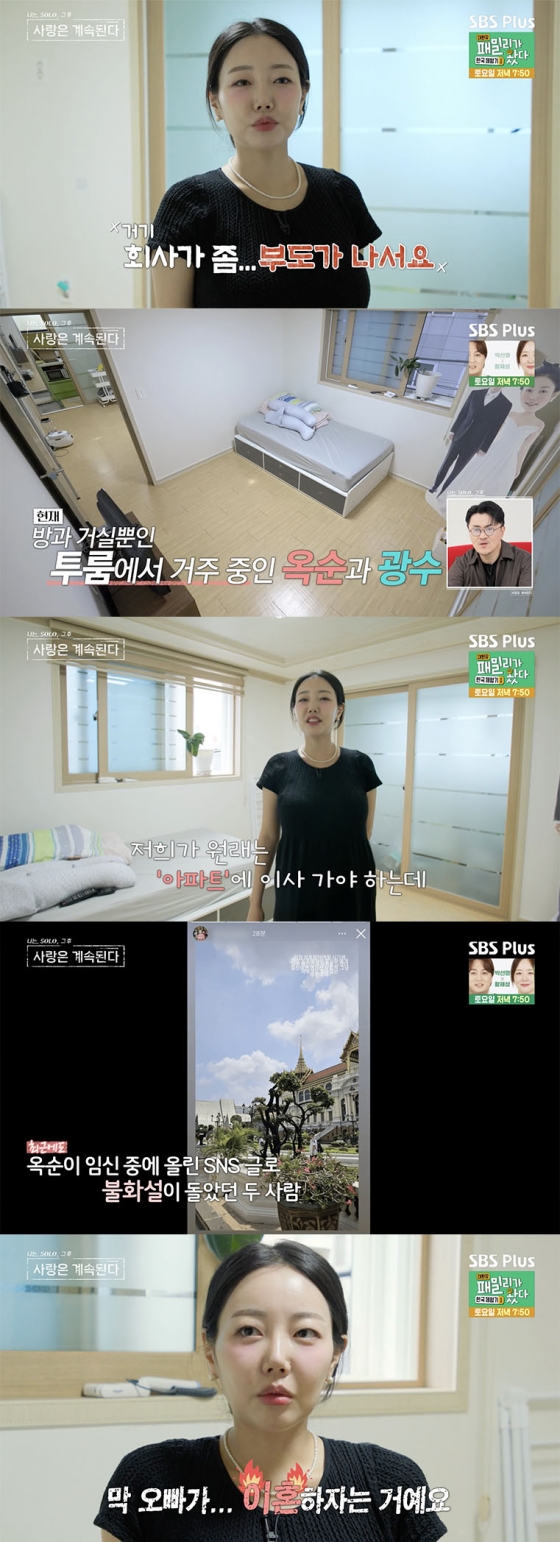 또한 옥순은 지난해 임신 중 올린 SNS 글로 불거졌던 '이혼설'에 대해서도 입을 열었다. 그는 "그때 저랑 오빠가 크게 싸운 후였다. 오빠가 (저랑 싸운 뒤) 이혼하자고 했다"라고 당시 광수의 발언을 폭로해 모두를 놀라게 했다.