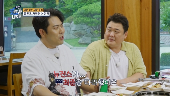 'THE 맛있는 녀석들'에서 코미디언 김해준이 걸 그룹 뉴진스가 자신을 따라 했다고 주장했다.