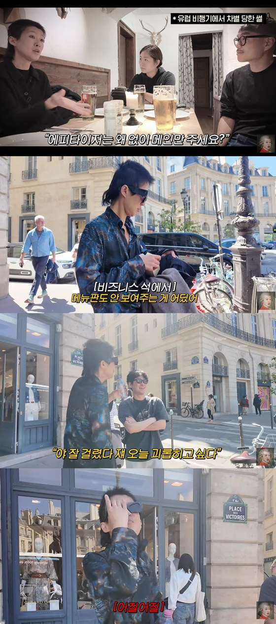 홍진경은 유럽 항공기 비즈니스석에 탑승해 기내식을 서빙 받던 중 "다른 애들은 에피타이저, 샐러드 주면서 연어를 갖고 오더라. 그래서 '에피타이저는 왜 없이 메인만 주냐'고 물어봤다. 그랬더니 어깻짓을 하더라"라고 황당해했다.