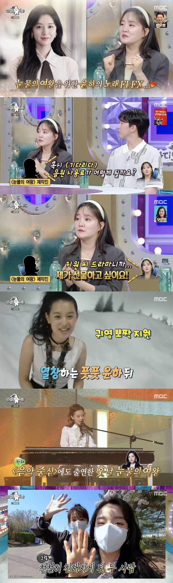 이날 윤하는 최애 드라마 '눈물의 여왕'을 위해 통 크게 자신의 음원 사용료를 쐈다고 밝혔다. 그는 "김지원 씨와 김수현 씨가 나오는 드라마 '눈물의 여왕' 측에서 방영시기에 제 곡 '기다리다'를 쓰고 싶다고 연락이 왔다. 제작진이 저에게 '음원 사용료를 어떻게 하면 될까요?'라고 묻더라"라고 당시 상황에 대해 설명했다.