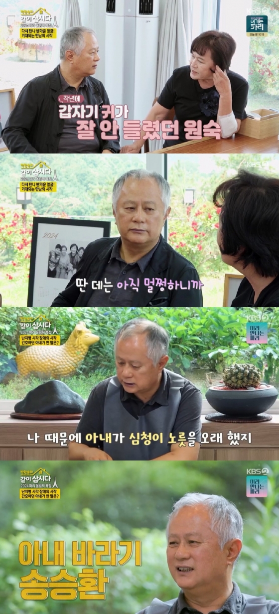 이어 아내에 대한 고마운 마음을 전한 송승환은 "나 때문에 아내가 심청이 노릇을 오래 했는데 간호하는 것도 하루 이틀이지 내가 헤매고 있으면 '감으로 해요'라고 하더라. 가끔 뺑덕어멈이 되기도 한다"고 웃었다.