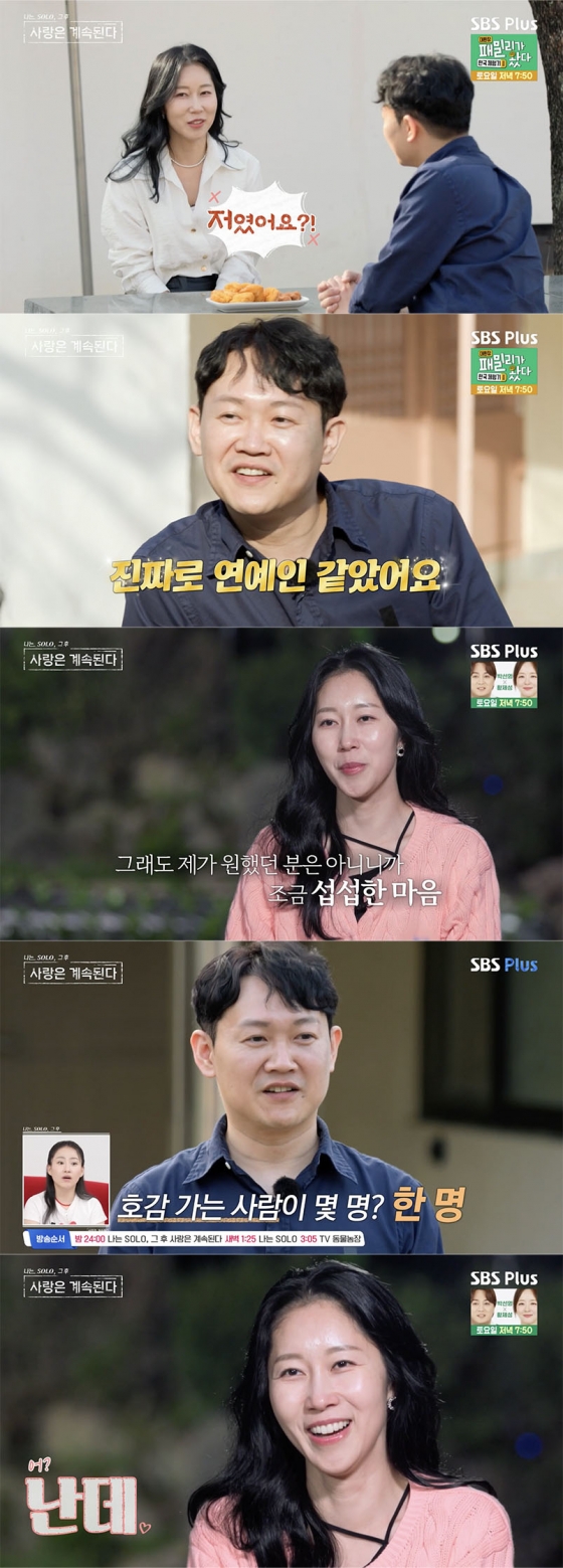 25일 오후 방송된 SBS 플러스, ENA 예능 프로그램 '나는 SOLO, 그 후 사랑은 계속된다(이하 '나솔사계')'에서는 14기 '미녀 삼총사' 영숙, 영자, 현숙과 미스터 강, 킴, 김, 박의 첫인상 선택이 진행됐다.