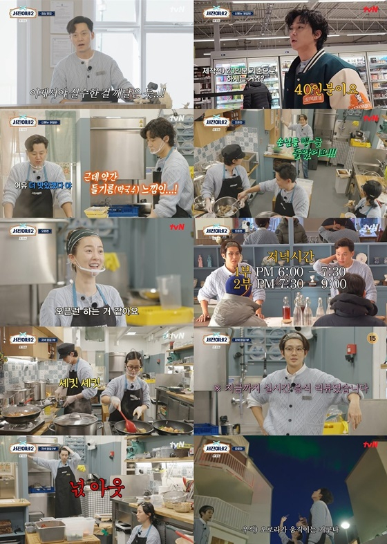 빠른 속도와 철저한 분업화로 주방 팀이 6시 타임 손님들의 음식을 모두 내보낸 후에는 홀 팀 정유미가 디저트 아이스크림 만들기에 돌입했다. 무엇보다 7시 30분 타임 손님들의 입장이 14분밖에 남지 않은 상황에서 추가 주문 디저트 서빙과 홀 정리, 설거지까지 끝내야 해 임직원들이 전력을 다했다. 7시 30분 타임 마지막 음식까지 조리를 마치자 열정의 아이콘 박서준마저 주저앉고 말았다.