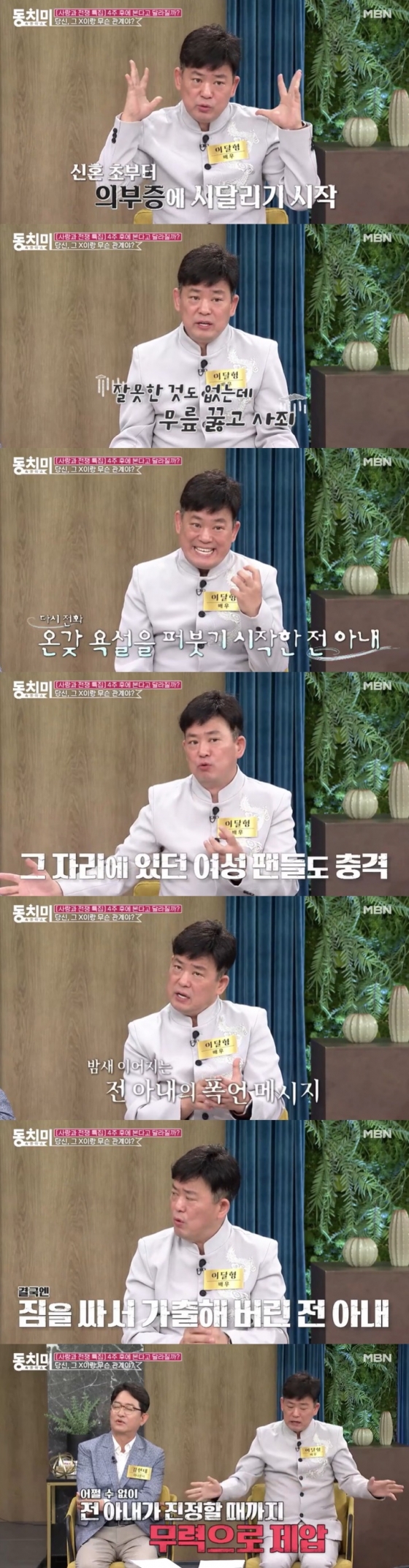 그는 "집에 와서 옷을 걸려고 봤더니 결혼 액자가 다 깨져있더라. 너무 화가나서 냉장고를 한 대 쳤다. 아내가 결국 또 짐을 싸서 가출했다. 이틀 후 새벽에 와서 '마누라가 밖에 있는데 잠이 와?'라며 손에 잡히는 대로 물건을 던졌다. 내 머리도 잡고 그럴 땐 어쩔 수 없이 나도 머리를 잡고 제압했다. 계속 나가고 반복이 됐다"라고 말했다.
