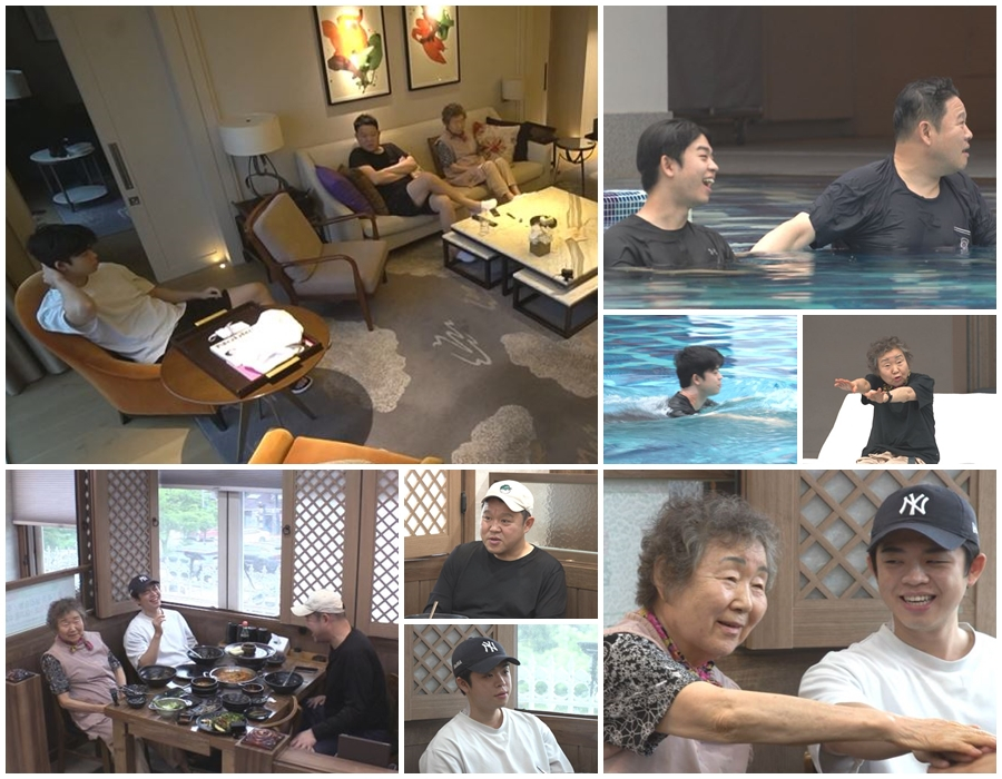 앞서 세 사람은 김구라가 '늦둥이 네 살 딸' 수현이, 아내와 사는 재혼집을 방문해 맛있는 집밥을 함께 먹은 뒤, 동현이가 결제한 초특급 호텔 스위트룸으로 '호캉스'를 떠났던 터. 이날 세 사람은 스위트룸에서 푹 자고 난 뒤, 아침 일찍부터 호텔 수영장으로 향한다. 직후, 동현이는 뛰어난 수영 실력을 선보여 아버지와 할머니를 깜짝 놀라게 한다. 김구라는 "수영을 가르친 보람이 있네. (해병대 입대를 앞두고) 걱정을 덜었다"라며 흐뭇하게 웃는다. 그러나 이내, 수영을 전혀 못 하는 '맥주병' 면모를 드러내 튜브 위에서 '몸개그'를 작렬한다. 매일 새벽 1000m 수영을 한다는 86세의 '수영 실력자' 박명옥 여사는 그런 아들에게 "머리 박고 발차기부터 시작해! 100개 해!"라고 '스파르타' 잔소리를 퍼부어 김구라를 진절머리 치게 만든다.