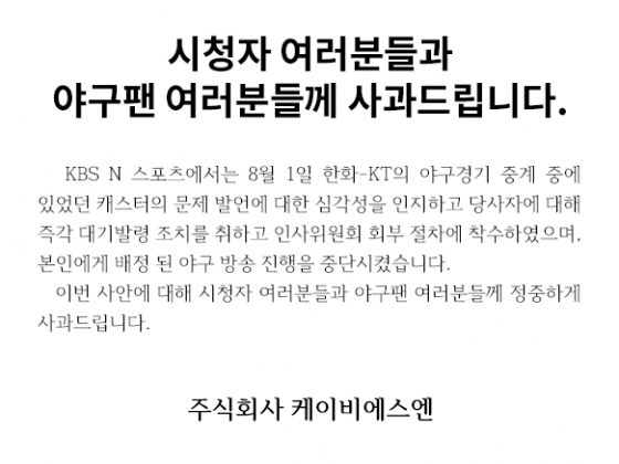 KBS N은 "이번 사안에 대해 시청자 여러분들과 야구팬 여러분들께 정중하게 사과드립니다"라고 전했다.