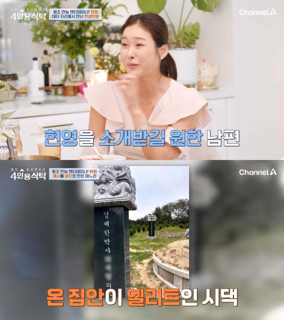또한 현영은 "(남편이) 결혼 후 선산에 데려갔는데 묘비에 집안 어른들 정보가 적혀있었다. '대단하긴 대단하구나'라고 느낀 게 온 집안 식구들이 다 서울대생이더라. 남편은 외국 대학을 나왔는데 시부모님이 서울대 CC(캠퍼스 커플)였다. 나도 깜짝 놀랐는데 그걸 결혼하고 알았다. 시댁에선 다 어려운 얘기하신다"고 말해 웃음을 안겼다.