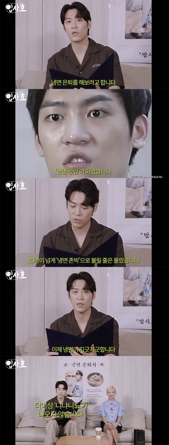 이어 존박은 준비해온 냉면 은퇴 선언문을 낭독했다. "저는 2013년 '방송의 적' 프로그램을 통해 '냉면 광인'이 되었다. 그때만 해도 10년 넘게 '냉면 존박'으로 불릴 줄 몰랐다"라고 밝혔다.