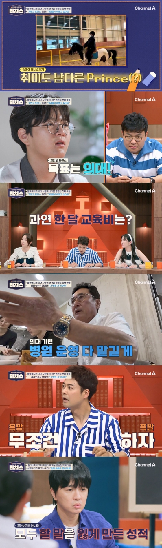 11일 방송되는 채널A '티처스'에는 승마와 테니스 등 각종 스포츠까지 모두 섭렵하고 '청춘 드라마' 주인공 같은 풋풋함까지 갖춘 고1 도전학생이 찾아온다. 도전학생은 "제가 장남이고 가업을 이어받을 의사가 되고 싶다. 중학교 때는 'All A'였는데 고등학교에서는 안 먹히더라. 의대에 진학할 수 있을지 걱정이다"라고 고민을 전했다. 도전학생의 부모님은 모두 할아버지가 설립한 병원에 근무 중이었다. 때문에 도전학생은 어려서부터 자연스럽게 '의사'라는 장래 희망을 가지게 됐다.